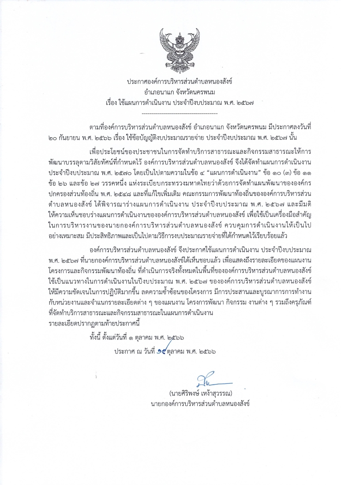 Posted in ข่าวประชาสัมพันธ์ ประกาศองค์การบริหารส่วนตำบลหนองสังข์ เรื่อง ใช้แผนการดำเนินงานประจำปีงบประมาณ 2567 mungmee 110748_1_20231102-105849