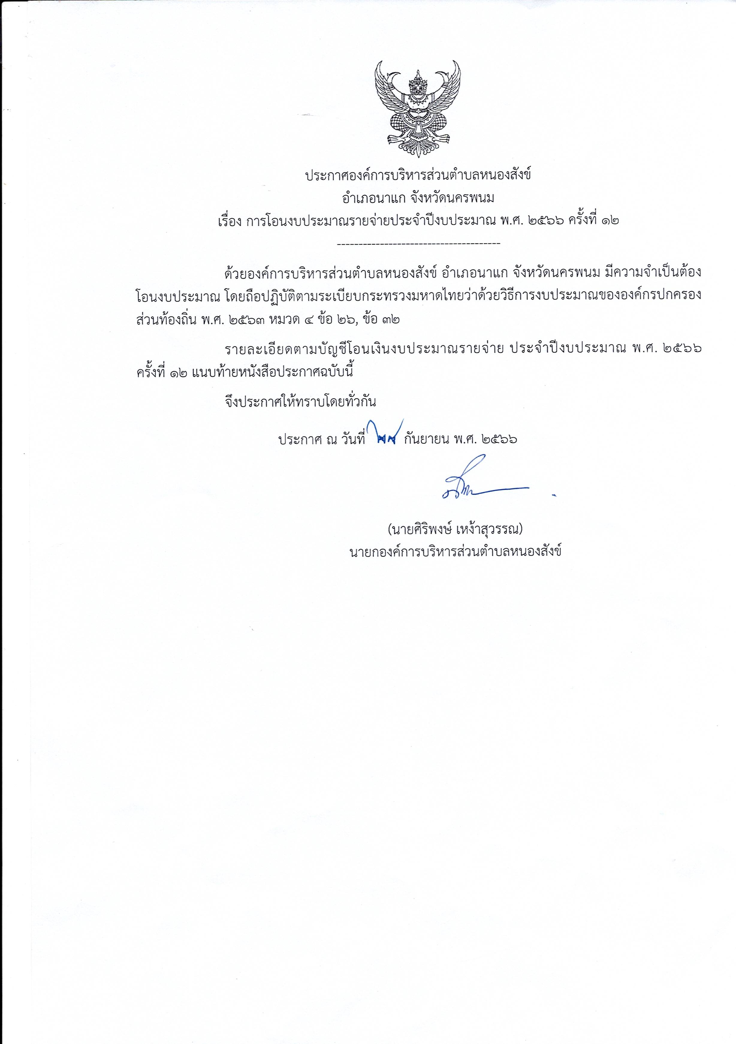 ประกาศโอนงบประมาณรายจ่ายประจำปี พ.ศ.2566 ครั้งที่ 12