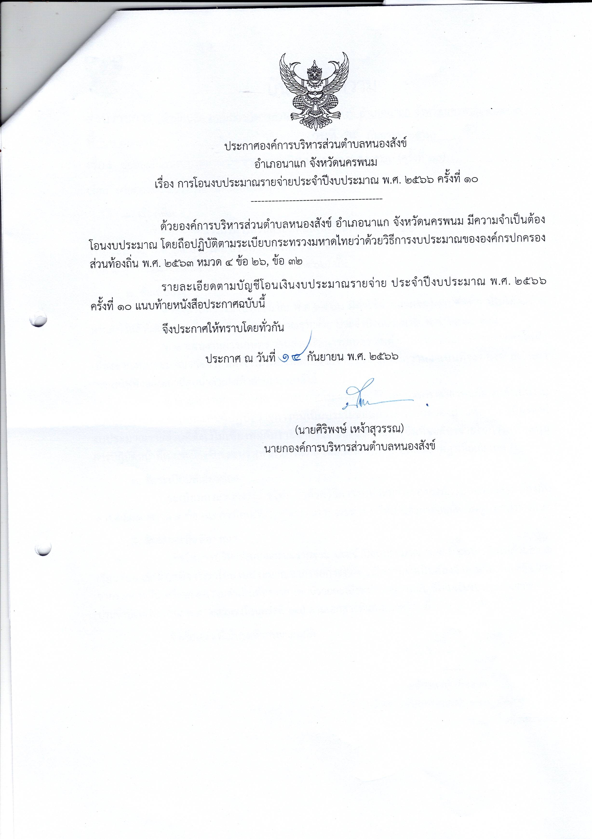 ประกาศโอนงบประมาณรายจ่ายประจำปี พ.ศ.2566 ครั้งที่ 10